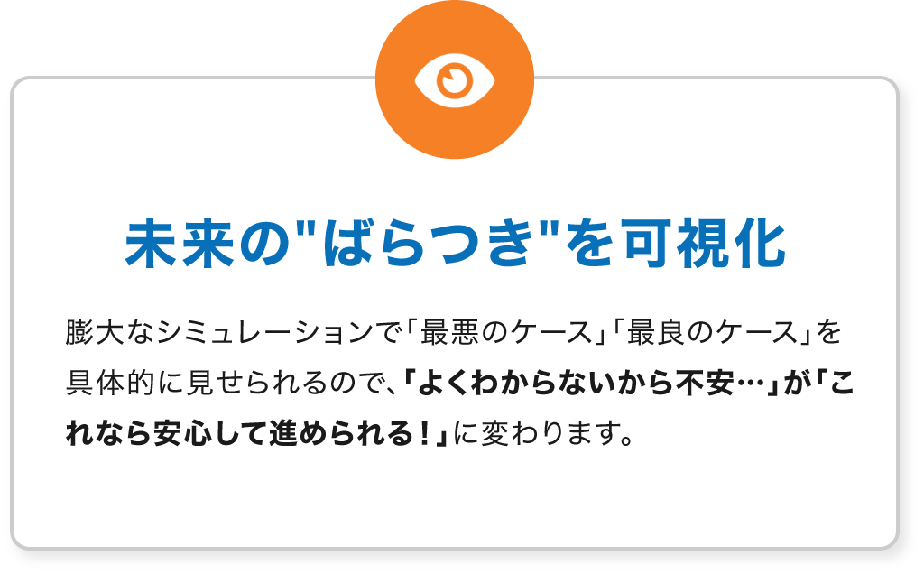 モンテカルロ・シミュレーションを活用し、ヒストグラムやパーセンタイル表示で「将来のばらつき」を一目瞭然に。