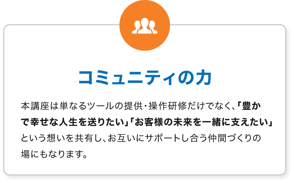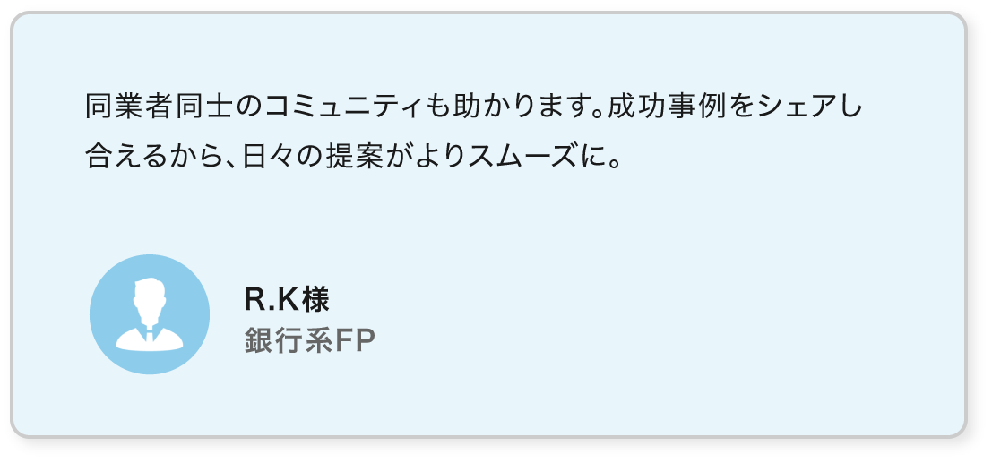 - 「人はみな、豊かで幸せに笑顔で暮らしたい」という信念のもと、同じ志を持つFP・アドバイザーの提案力強化を支援中。