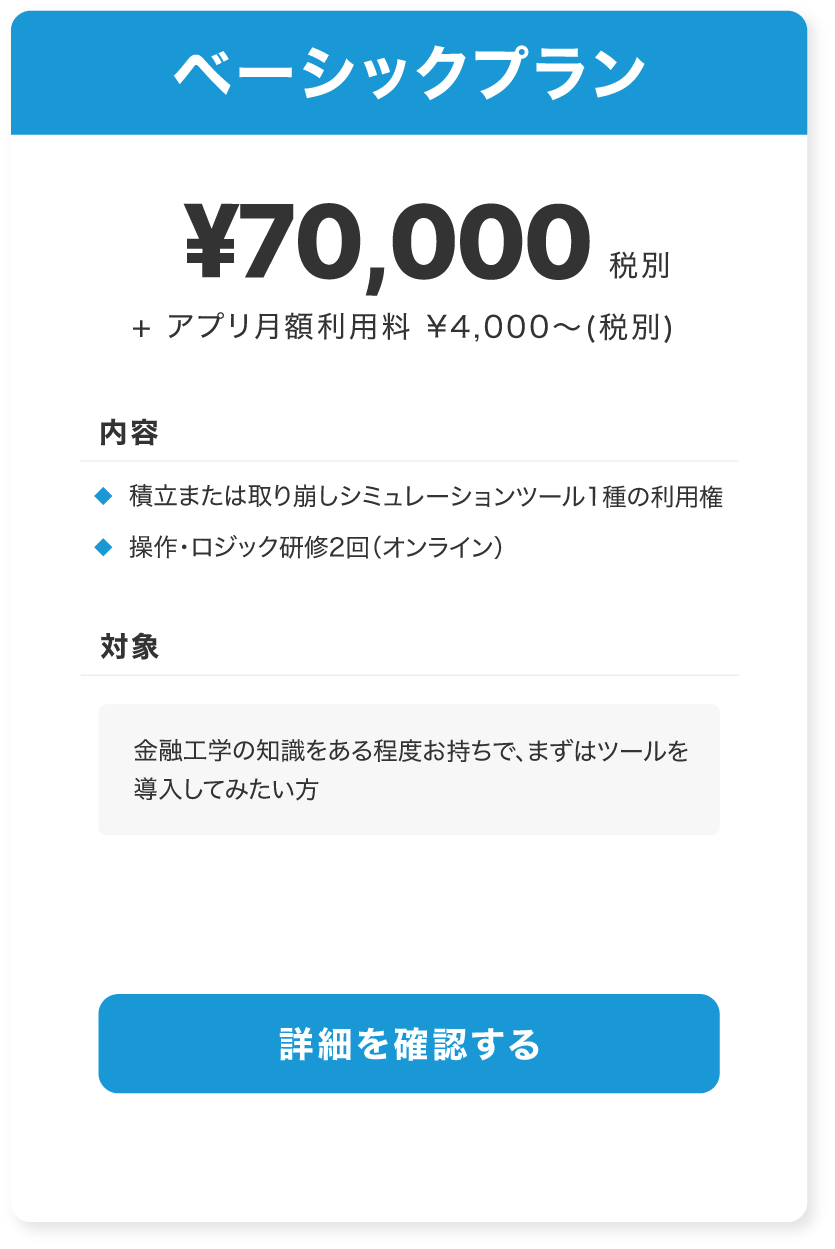 初期投資額・積立額・運用期間・リスク・リターンなどを入力するだけ。複雑な金融工学の知識は不要です。