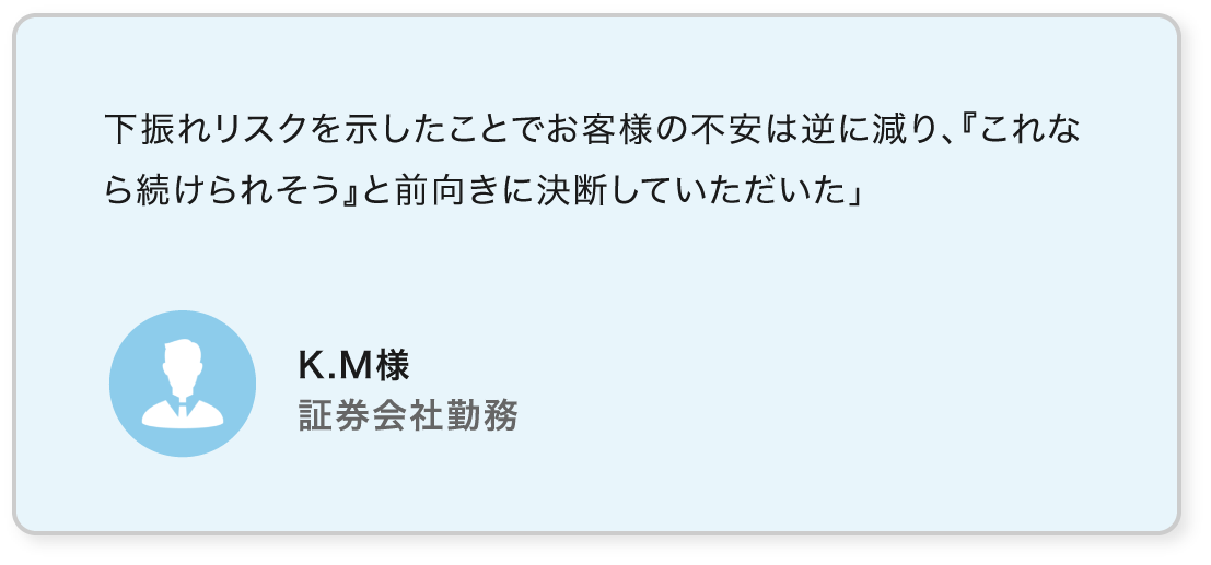 - お客様との対話を大切にし、「わかりやすさ」「納得感」「継続性」を重視した運用アドバイスが好評。